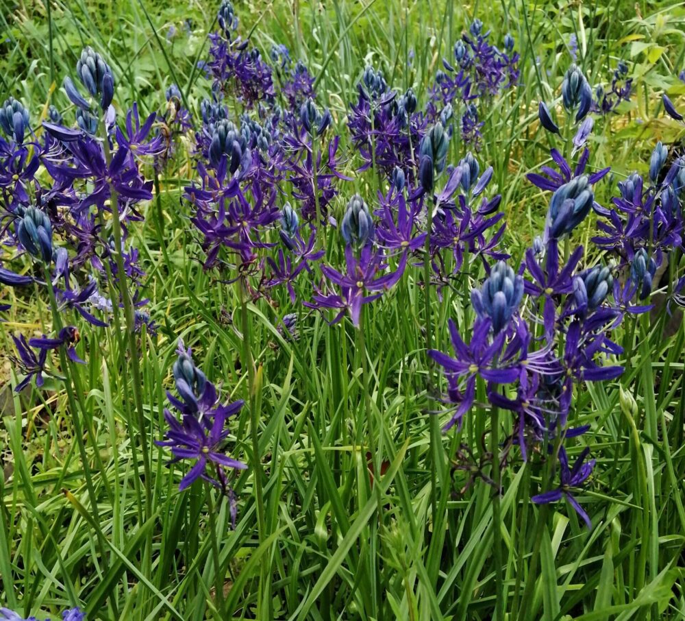 This grows widely in North America in damp meadows and along stream banks. The bulbs were even used by Indian tribes to make a kind of bread. This is a valuable plant in grass with 12″ spikes of starry mid blue flowers in May.