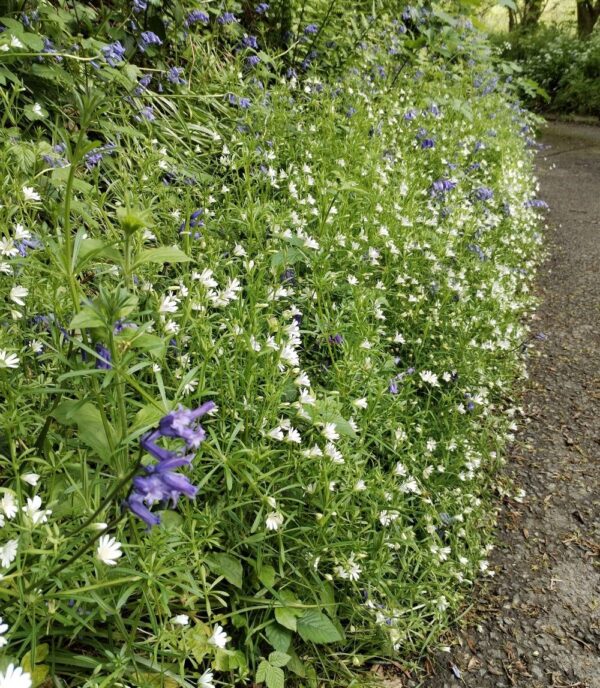 Also called satin flower because of the shining quality of its pure white flowers. This is an invaluable plant for semi shade, and growing with bluebells and red campion, it provides the perfect foil for those rich colours. The name stitchwort is ancient and refers to its use for curing sudden pains or stitches, believed to be caused by elf arrows.