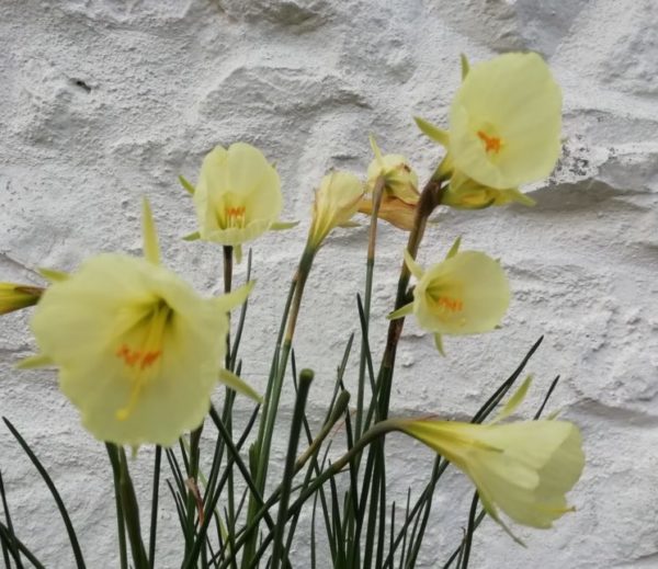 A very new Hoop Petticoat grown from a chance seedling in North Holland. She creates magic with her creamy white Narcissus bulbocodium petticoat corona. The bulbs produce a succession of flowers on 6” stems, making a long-lasting display in a border, pot or grassy bank.