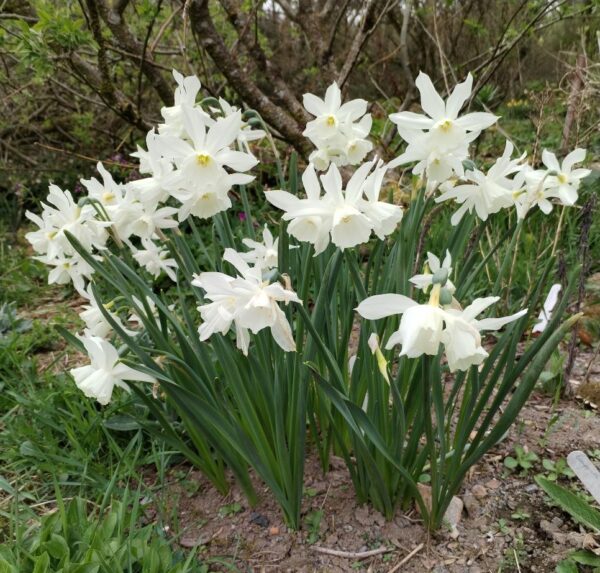 A mid-season variety, flowering March-April with eye-catching milk white flowers, in a form strongly recalling its triandrus parent. It has 3 to 4 long lasting flowers per stem. Another short daffodil, it is vigorous and a good naturaliser.