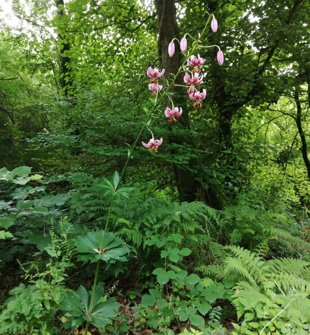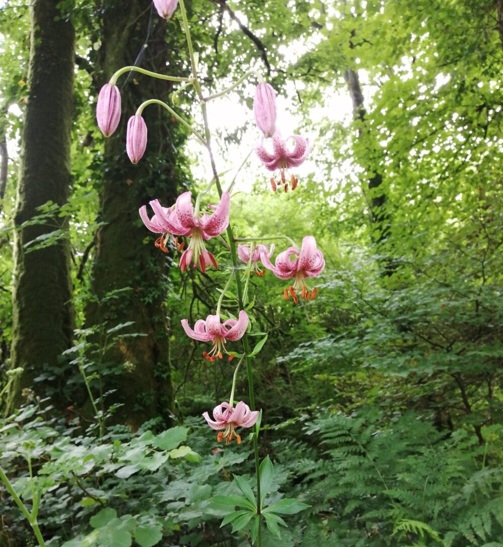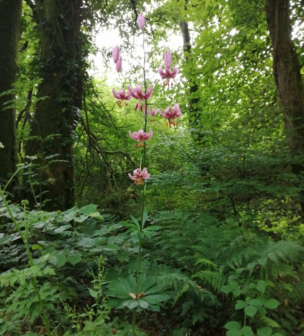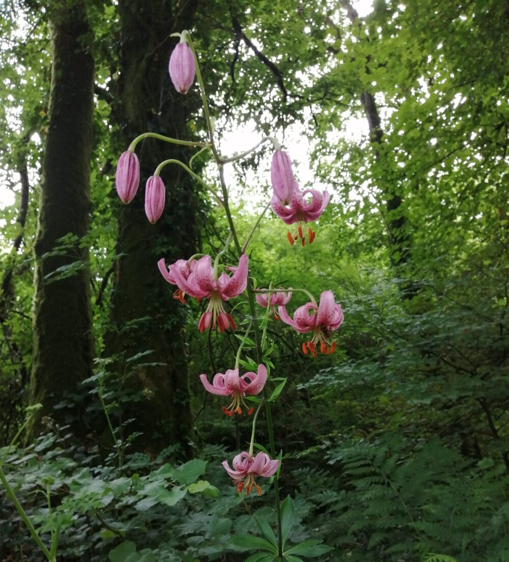 A base rooting lily which is naturalised in woods and hedgerows in Southern Britain. It has numerous, scented, nodding ‘Turk’s cap’ flowers in shades of pink and amber with darker spots. Flowers in mid-summer. AGM